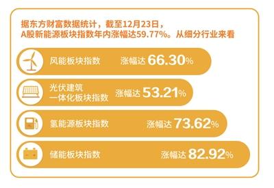 據(jù)東方財(cái)富數(shù)據(jù)統(tǒng)計(jì),截至12月24日,A股新能源板塊指數(shù)年內(nèi)漲幅達(dá)54.27%,從細(xì)分行業(yè)來(lái)看,風(fēng)能板塊指數(shù)漲幅達(dá)62.66%,光伏建筑一體化板塊指數(shù)年內(nèi)漲幅達(dá)47.74%,氫能源板塊指數(shù)年內(nèi)漲幅達(dá)68.06%,儲(chǔ)能板塊指數(shù)漲幅達(dá)77.02%。