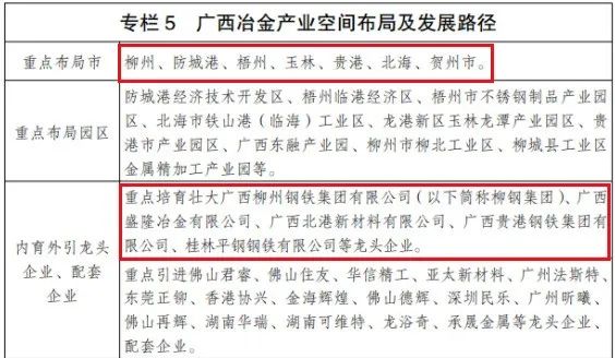 “十四五”時(shí)期,廣西重點(diǎn)發(fā)展先進(jìn)鋼鐵新材料、不銹鋼,加快發(fā)展汽車、家電、裝備制造等領(lǐng)域用材,堅(jiān)持控上游強(qiáng)中游擴(kuò)下游,全面推廣減碳降耗先進(jìn)技術(shù),推動(dòng)冶金產(chǎn)品向中高端升級(jí),推進(jìn)廣西企業(yè)與央企戰(zhàn)略重組,開展國(guó)際產(chǎn)能合作,建設(shè)原料保障可靠、精深加工突出、優(yōu)勢(shì)產(chǎn)品豐富、具有全國(guó)重要影響力的產(chǎn)業(yè)鏈。先進(jìn)鋼鐵新材料重點(diǎn)發(fā)展特種金屬材料、高性能結(jié)構(gòu)材料、高強(qiáng)輕質(zhì)合金材料。不銹鋼重點(diǎn)發(fā)展300系、400系不銹鋼及裝飾、廚衛(wèi)等制品,開發(fā)應(yīng)用于能源裝備、環(huán)保設(shè)備、汽車制造等領(lǐng)域的產(chǎn)品。建設(shè)防城港、柳州、梧州、賀州再生鋼鐵加工產(chǎn)業(yè)基地,構(gòu)建防城港—北海—玉林—梧州不銹鋼產(chǎn)業(yè)帶。