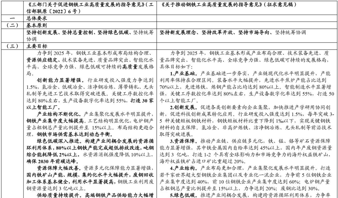 2020年12月31日,工信部發(fā)布《關(guān)于推動(dòng)鋼鐵工業(yè)高質(zhì)量發(fā)展的指導(dǎo)意見(征求意見稿)》(以下簡稱《征求意見稿》),正式文件的出臺(tái)與之時(shí)隔一年。相比較,《指導(dǎo)意見》進(jìn)一步全面、密切銜接《“十四五”原材料工業(yè)發(fā)展規(guī)劃》《中共中央 國務(wù)院關(guān)于完整準(zhǔn)確全面貫徹新發(fā)展理念做好碳達(dá)峰碳中和工作的意見》等相關(guān)政策文件,做了多處改動(dòng),主要差異對(duì)比見附表。