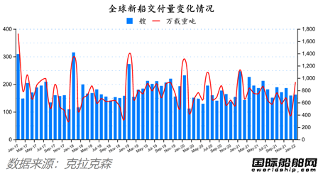 克拉克森數(shù)據(jù)顯示,2022年1月份全球船廠共交付新船162艘,共計(jì)9334500載重噸。與2021年12月份全球新船交付訂單159艘,共計(jì)3891538載重噸相比較,數(shù)量環(huán)比上升1.89%,載重噸環(huán)比上升139.87%。與2021年1月份全球船廠共交付新船247艘,共計(jì)11397839載重噸相比較,數(shù)量同比下跌34.41%,載重噸同比下跌18.10%。