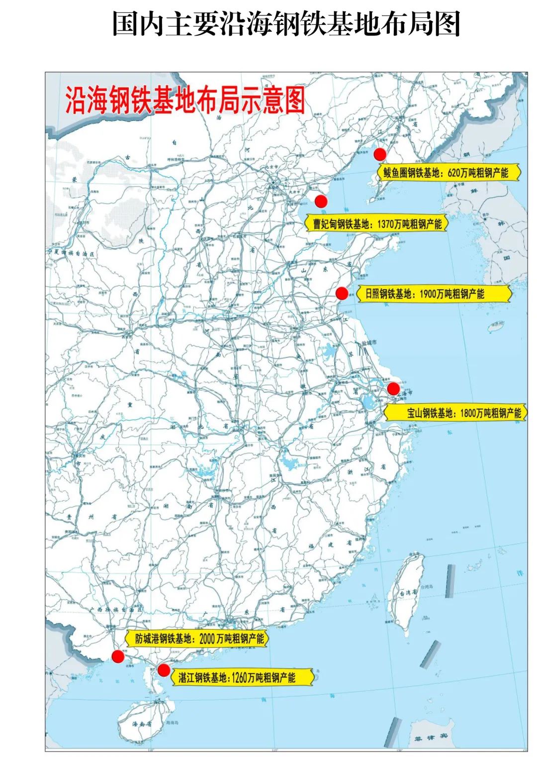 目前,我國(guó)已形成鲅魚圈鋼鐵基地、曹妃甸鋼鐵基地、日照鋼鐵基地、寶山鋼鐵基地、湛江鋼鐵基地、防城港鋼鐵基地等六大主要沿海鋼鐵基地,其中崛起的防城港鋼鐵基地粗鋼產(chǎn)量已超2000萬(wàn)噸,而各個(gè)沿海鋼鐵基地的頭部企業(yè)均為鞍鋼、首鋼京唐、寶鋼等大型鋼企,輻射市場(chǎng)已遍及全國(guó)。