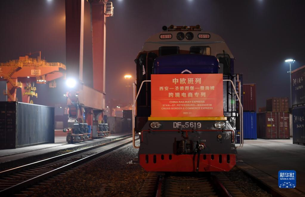 2021年12月31日晚,中歐班列長安號(hào)跨境電商專列在西安國際港站準(zhǔn)備出發(fā)開往德國曼海姆。新華社記者 李一博 攝
