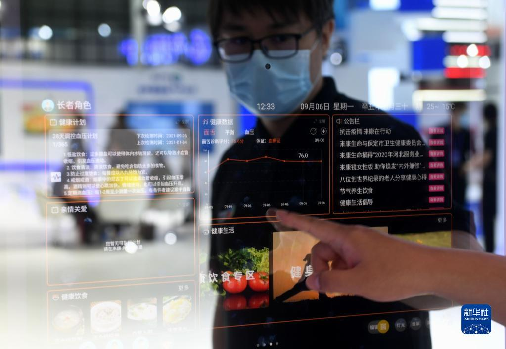 2021年9月6日,在河北石家莊舉行的2021中國國際數(shù)字經(jīng)濟(jì)博覽會(huì)上,工作人員在操作智能鏡子。新華社記者 王曉 攝