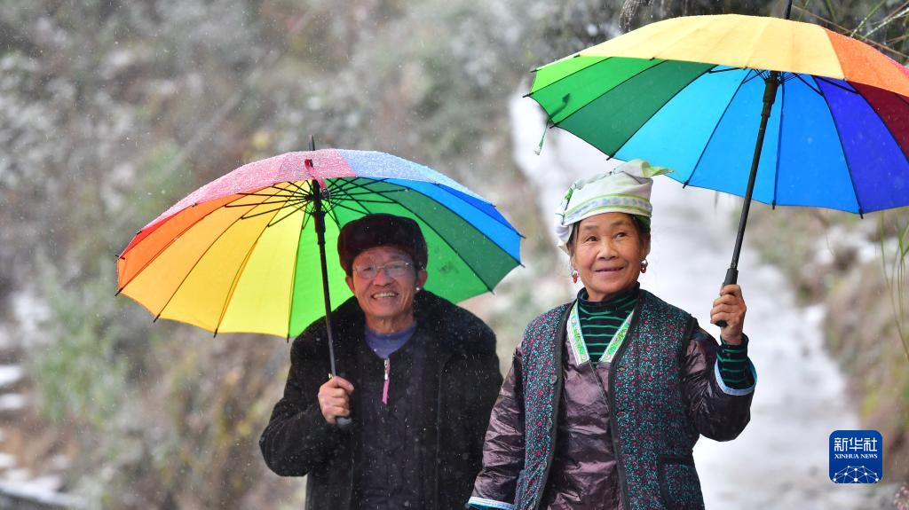 在烏英苗寨,村民梁安合和妻子梁英迷在賞雪(2021年12月26日攝)。烏英苗寨位于桂黔交界的大苗山深處,曾經(jīng)是一個(gè)極度貧困的苗寨。2020年,烏英苗寨實(shí)現(xiàn)整體脫貧。新華社記者 黃孝邦 攝