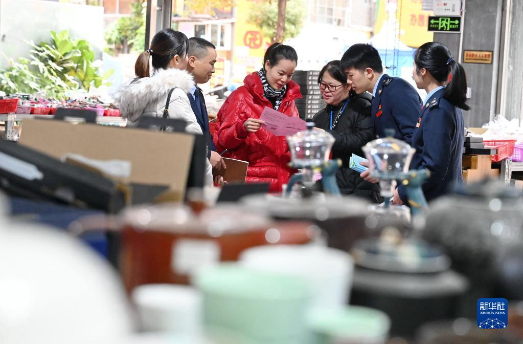 2020年12月17日,在福建省德化縣,稅務(wù)工作人員向一家電商企業(yè)負(fù)責(zé)人(左三)宣傳介紹疫情防控期間小微企業(yè)的稅收優(yōu)惠政策。新華社記者 林善傳 攝