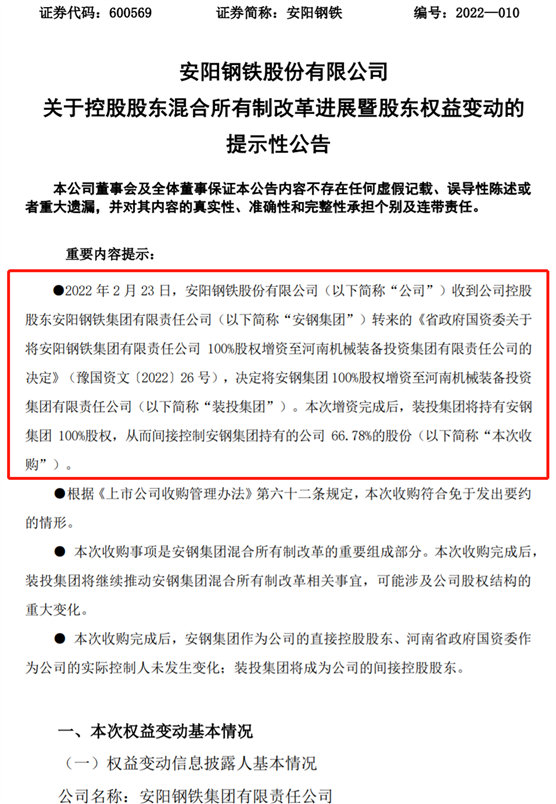 安陽(yáng)鋼鐵2月23日發(fā)布公告,河南省國(guó)資委將安鋼集團(tuán)100%股權(quán)增資至河南機(jī)械裝備投資集團(tuán)有限責(zé)任公司(簡(jiǎn)稱“裝投集團(tuán)”)。本次增資完成后,裝投集團(tuán)將持有安鋼集團(tuán)100%股權(quán),從而間接控制安鋼集團(tuán)持有的公司66.78%的股份。安鋼集團(tuán)作為公司的直接控股股東、河南省國(guó)資委作為公司的實(shí)際控制人未發(fā)生變化;裝投集團(tuán)將成為公司的間接控股股東。