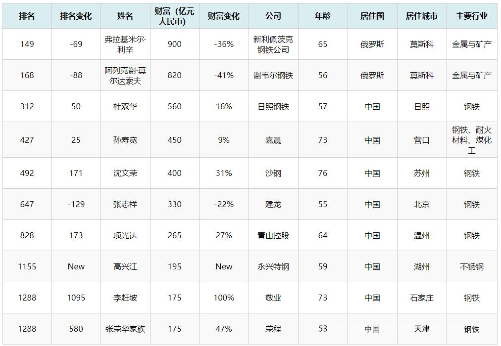 國內(nèi)鋼鐵行業(yè),杜雙華(560億)、方威(465億)、孫壽寬(450億)、沈文榮、張志祥、項(xiàng)光達(dá)、高興江、李趕坡、張榮華、董才平、王樹華、劉鋒、丁立國等多位企業(yè)家上榜。