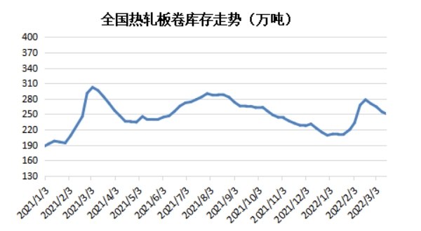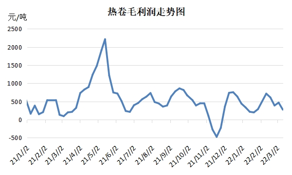 截止到3月18日,鋼廠熱卷利潤為207元/噸,較2月底減少183元/噸,較采暖季之前減少267.2元/噸。近期鋼廠熱卷利潤情況呈現(xiàn)震蕩減少情況,主要原因在于原料上漲與熱卷價(jià)格走低的矛盾影響。原料方面,年后焦炭經(jīng)歷四輪提漲,提振原料成本上行;而近期熱卷市場跟隨政策面以及消息面波動(dòng),但終端需求仍未如期啟動(dòng),疊加公共突發(fā)事件影響,交投弱勢下,熱卷價(jià)格呈現(xiàn)寬幅震蕩走勢。
