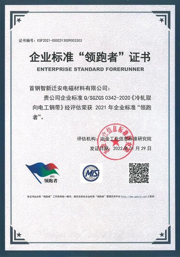 2022年,首鋼股份智新電磁公司企業(yè)標(biāo)準(zhǔn)Q/SGZGS0342-2020《冷軋取向電工鋼帶》榮獲2021年全國(guó)企業(yè)標(biāo)準(zhǔn)“領(lǐng)跑者”稱號(hào),這是繼智新電磁獲評(píng)2020年河北省企業(yè)標(biāo)準(zhǔn)“領(lǐng)跑者”后獲得的又一殊榮。