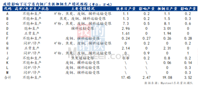 受近期東北地區(qū)疫情形勢嚴峻、管控整體偏嚴影響,遼寧省內(nèi)物流運輸受影響較大,特別在跨市運輸方面,由于各市管控政策不一、正常運營的貨車數(shù)量稀少,大宗商品資源流動性整體較差。Mysteel調(diào)研了遼寧省內(nèi)10家長流程(高爐)鋼廠和3家短流程(電弧爐)鋼廠,僅兩家鋼廠正常生產(chǎn),有4家鋼廠由于原料運輸不暢、已進入悶爐或停產(chǎn)狀態(tài),另有7家鋼廠遭受不同程度的影響。