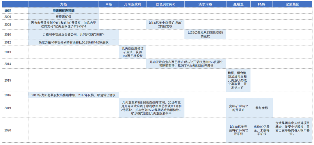 2010年7月29日,中鋁與力拓簽訂西芒杜聯(lián)合開發(fā)協(xié)議,雙方成立合資公司,共同開發(fā)西芒杜鐵礦(南部3、4號區(qū)塊),力拓、中鋁分別擁有西芒杜項目50.35%和44.65%股權(quán)。擁有西芒杜北部1、2號區(qū)塊的BSGR集團(tuán)則選擇淡水河谷作為合作伙伴。