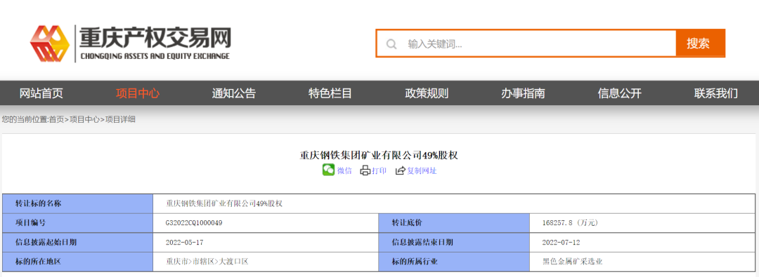 四、2022年3月7日,轉(zhuǎn)讓方重慶渝富控股集團(tuán)有限公司向重慶鋼鐵(集團(tuán))有限責(zé)任公司發(fā)出《重慶渝富控股集團(tuán)有限公司關(guān)于掛牌轉(zhuǎn)讓所持重鋼礦業(yè)股權(quán)的函》。2022年3月31日,重鋼集團(tuán)回復(fù)《關(guān)于重慶渝富控股集團(tuán)有限公司征求掛牌轉(zhuǎn)讓所持重鋼礦業(yè)49%股權(quán)意見的復(fù)函》,附條件同意轉(zhuǎn)讓方掛牌轉(zhuǎn)讓重鋼礦業(yè)49%股權(quán)。
