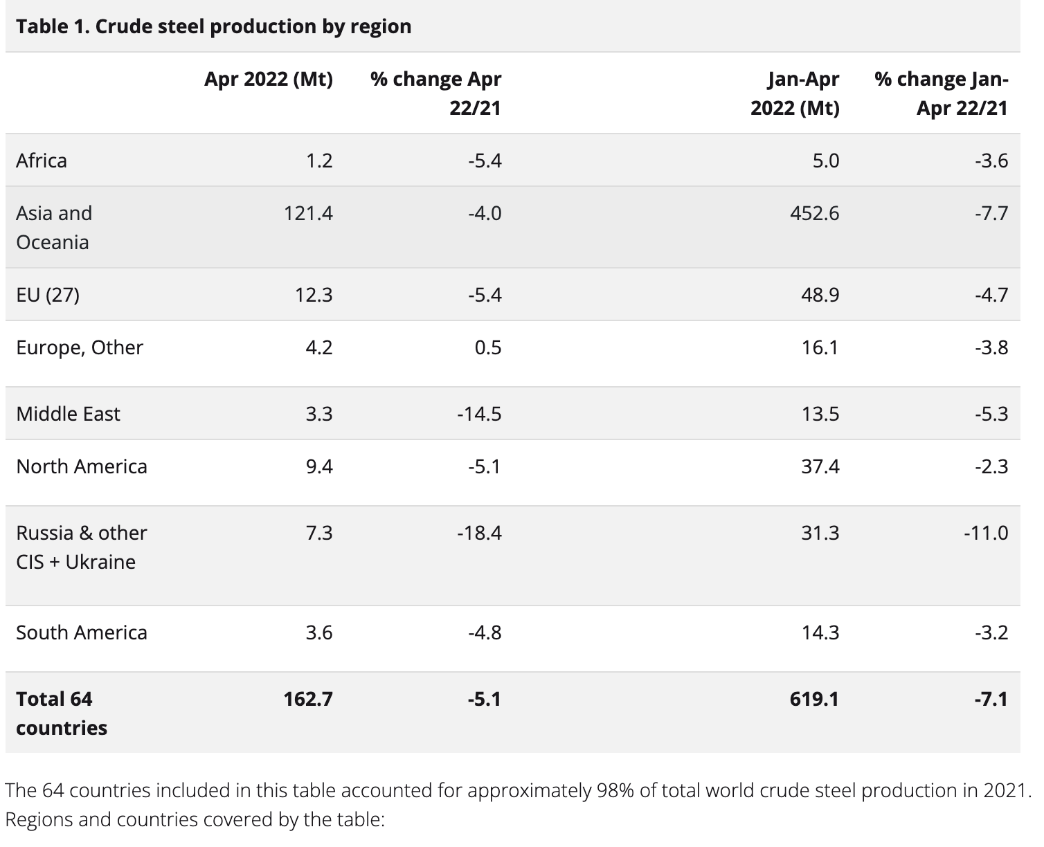據(jù)世界鋼鐵協(xié)會發(fā)布的數(shù)據(jù),2022年4月全球粗鋼產(chǎn)量同比下降5.1%至1.627億噸。中國4月的粗鋼產(chǎn)量為9280萬噸,同比下降了5.2%;印度4月產(chǎn)量為1010萬噸,同比增長6.2%;日本4月產(chǎn)量為750萬噸,同比下降了4.4%;美國4月產(chǎn)量為690萬噸,同比下降3.9%。