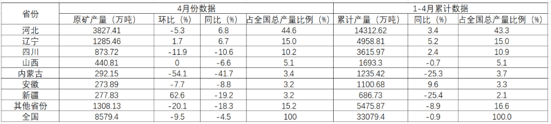 同去年4月相比(同比),除河北和遼寧外,其他省份鐵礦石原礦產量均出現了下滑,其中內蒙古同比下降41.7%,成為七大鐵礦石產礦省份中下降幅度最大的省份。