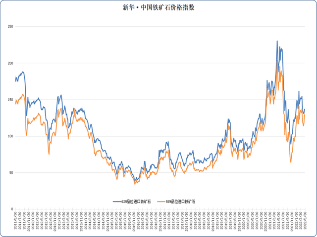 新華·中國鐵礦石價(jià)格指數(shù)顯示,5月24日至5月30日間,進(jìn)口鐵礦石價(jià)格窄幅波動(dòng)。數(shù)據(jù)顯示,5月30日,我國62%品位進(jìn)口鐵礦石價(jià)格指數(shù)為137,較5月23日上漲0.74%;58%品位進(jìn)口鐵礦石價(jià)格指數(shù)為129,較5月23日持平。