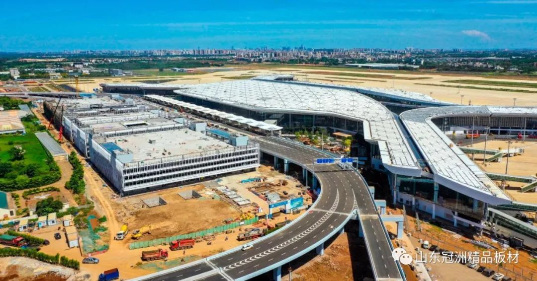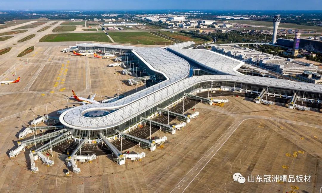 機(jī)場航站樓圍護(hù)系統(tǒng)選用冠洲氟碳彩涂板。