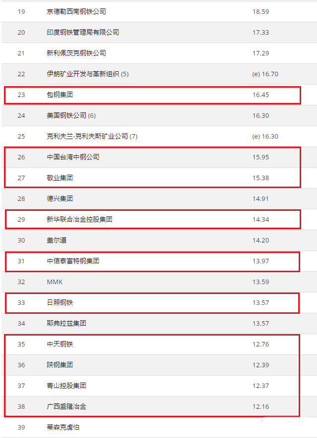 進入前50的中國鋼企還有:山東鋼鐵集團、德龍鋼鐵集團、華菱鋼鐵集團、方大集團、柳鋼集團、包鋼集團、中國臺灣中鋼公司、敬業(yè)集團、新華聯合冶金控股集團、?中信泰富特鋼集團、日照鋼鐵、中天鋼鐵、陜鋼集團、青山控股集團、廣西盛隆冶金、南京鋼鐵集團、福建三鋼集團、東海特鋼、新余鋼鐵集團、安鋼集團、酒鋼集團等。