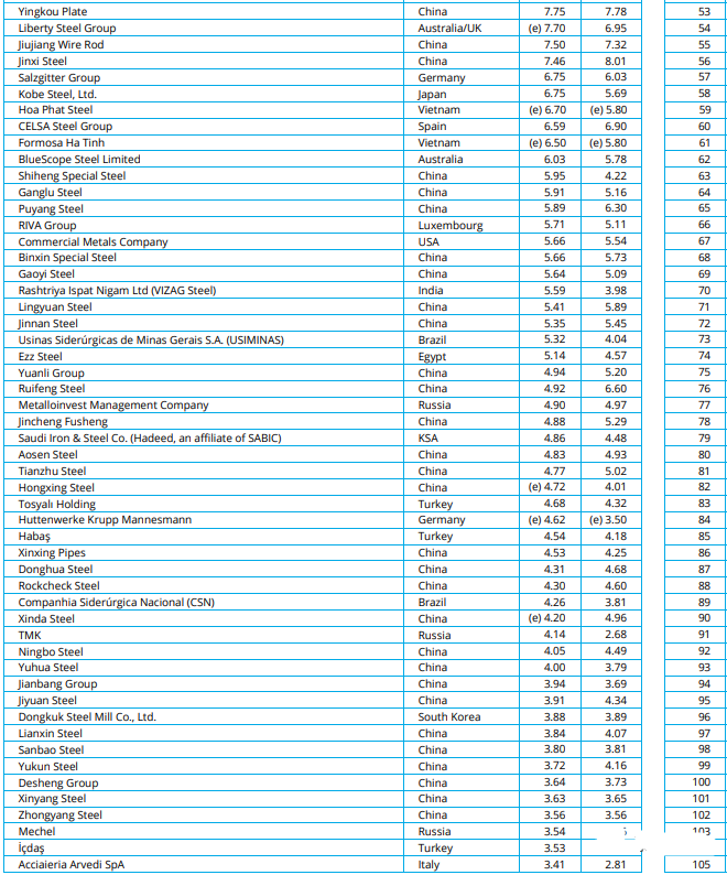排名前十的還有:日本制鐵4946萬噸、沙鋼4423萬噸、浦項4296萬噸、河鋼4164萬噸、建龍3671萬噸、首鋼3543萬噸、塔塔3059萬噸。
