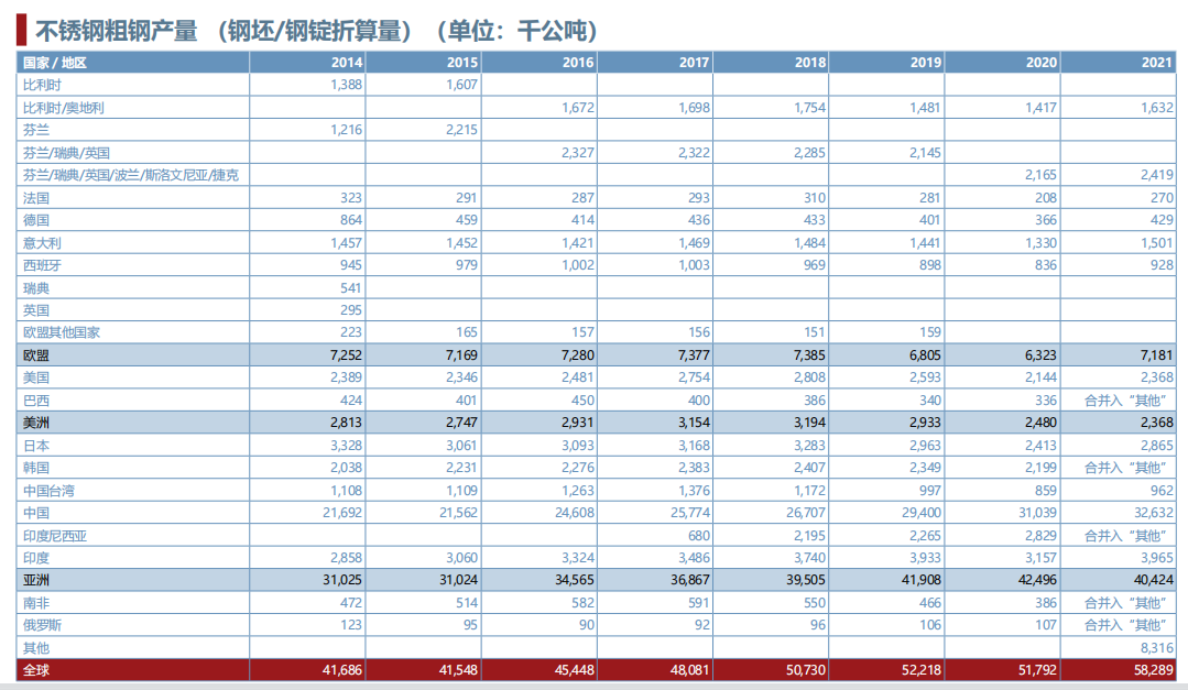 各個(gè)國家不銹鋼粗鋼產(chǎn)量:
