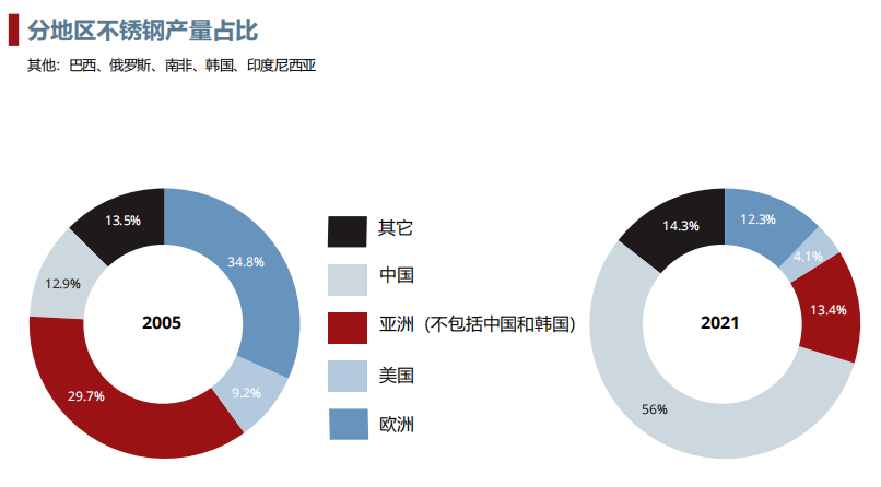 2005年,各地區(qū)不銹鋼占比分別為:中國12.9%、亞洲(不包括中國和韓國)29.7%、美國9.2%、歐洲34.8%、其他(巴西、俄羅斯、南非、韓國、印度尼西亞)13.5%。2021年,各地區(qū)不銹鋼占比分別為:中國56%、亞洲(不包括中國和韓國)13.4%、美國4.1%、歐洲12.3%、其他(巴西、俄羅斯、南非、韓國、印度尼西亞)14.3%。