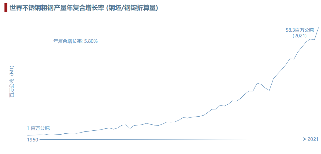 1950年,世界不銹鋼粗鋼產(chǎn)量100萬噸,到2021年達(dá)到5830萬噸,年復(fù)合增長率達(dá)5.8%。