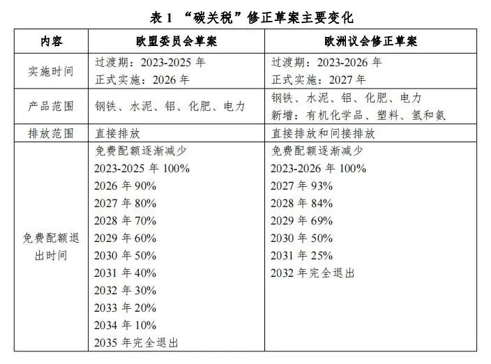 當(dāng)?shù)貢r(shí)間6月22日,歐洲議會(huì)多數(shù)票通過碳邊境調(diào)節(jié)機(jī)制(又稱“碳關(guān)稅”,簡稱CBAM)的“一讀”文本,對(duì)歐盟委員會(huì)“2021年7月公布減碳55%提案提出了正式修正意見”。與歐盟委員會(huì)一年前的“立法草案”相比,歐洲議會(huì)本次通過的修正草案擴(kuò)大了納入行業(yè)范圍、增加間接排放、加快免費(fèi)配額退出時(shí)間,延長了過渡期,主要變化如表1所示。