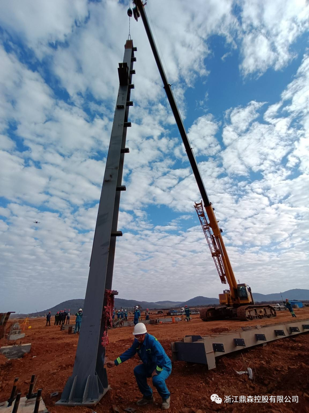 歷時三十余分鐘,立柱吊裝、安裝并合鉚緊固完成。這不僅是機修車間的第一根立柱,也是鼎森鋼鐵項目的第一根立柱,標志著鼎森鋼鐵已經牢牢的扎根于南部非洲這片沃土。