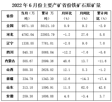 2022年6月份,河北、遼寧、四川、山西、內(nèi)蒙古、安徽、山東、新疆八大主要產(chǎn)礦省份的鐵礦石原礦產(chǎn)量為8889.15萬(wàn)噸,同比增加1217.43萬(wàn)噸,增幅15.9%;八大產(chǎn)礦省份的產(chǎn)量占全國(guó)總產(chǎn)量的90.1%,較去年同期占比增加2.7個(gè)百分點(diǎn)。1—6月份八大產(chǎn)礦省份累計(jì)鐵礦石產(chǎn)量為44102.11萬(wàn)噸,同比增長(zhǎng)3.2%。