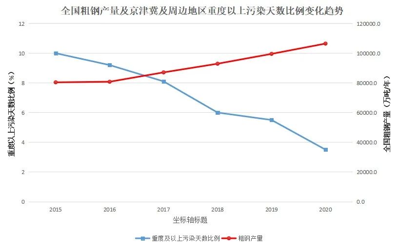 圖2 全國粗鋼產(chǎn)量及京津冀周邊地區(qū)重度以上污染天數(shù)比例變化趨勢