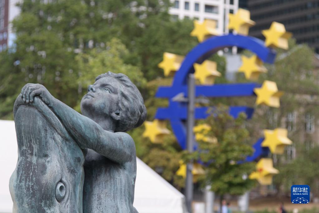 這是9月8日在德國法蘭克福拍攝的歐元雕塑和一座噴泉雕塑。(新華社記者單瑋怡攝)