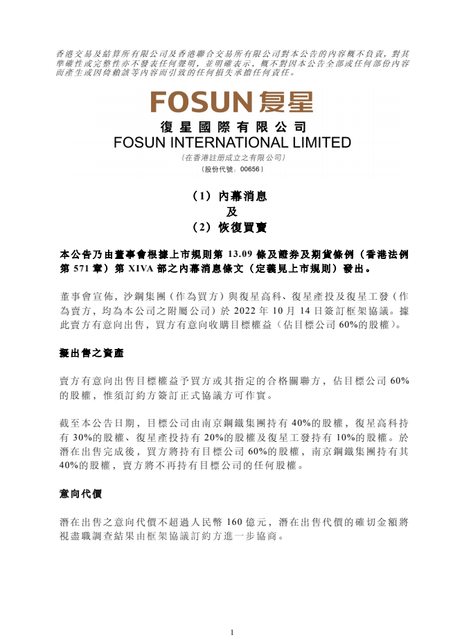 此外,復(fù)星國際已向香港聯(lián)交所申請于2022年10月20日(星期四)上午九時正起恢復(fù)股份買賣。