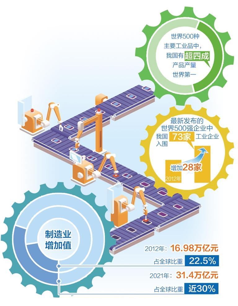 黨的二十大報(bào)告提出,我國(guó)制造業(yè)規(guī)模穩(wěn)居世界第一,明確提出堅(jiān)持把發(fā)展經(jīng)濟(jì)的著力點(diǎn)放在實(shí)體經(jīng)濟(jì)上,推進(jìn)新型工業(yè)化,加快建設(shè)制造強(qiáng)國(guó)、質(zhì)量強(qiáng)國(guó)、航天強(qiáng)國(guó)、交通強(qiáng)國(guó)、網(wǎng)絡(luò)強(qiáng)國(guó)、數(shù)字中國(guó)。非凡十年,中國(guó)制造業(yè)屢創(chuàng)奇跡,牢牢站穩(wěn)世界“C位”,在由大到強(qiáng)之路上勇毅前行。