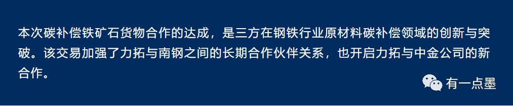 力拓集團、南京鋼鐵(以下簡稱南鋼)和中國國際金融股份有限公司(以下簡稱中金公司)已達成協(xié)議,將合作推進中國鋼鐵行業(yè)首單碳補償鐵礦石貨物的交易。合作方預計將于2022年10月完成貨物交付和碳信用額的注銷。