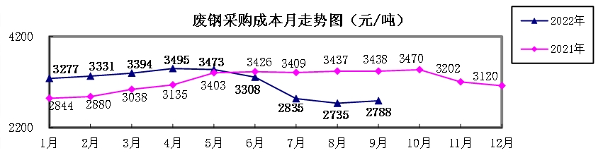 廢鋼9月份加權(quán)平均采購(gòu)成本為2788.17元/噸,環(huán)比升高52.73元/噸,升幅為1.93%。1-9月累計(jì)平均采購(gòu)成本為3226.27元/噸,同比下降8.90元/噸,降幅為0.28%。