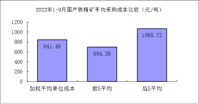 1-9月對(duì)標(biāo)企業(yè)國(guó)產(chǎn)鐵精礦折算成62%品位的平均采購(gòu)成本為841.48元/噸,成本最低的前5家企業(yè)依次是九江萍鋼鋼鐵有限公司、四川川威鋼鐵集團(tuán)公司、四川德勝集團(tuán)釩鈦有限公司、陜西略陽(yáng)鋼鐵有限公司、昆明鋼鐵股份有限公司,這5家企業(yè)的加權(quán)平均采購(gòu)成本為694.39元/噸,比對(duì)標(biāo)企業(yè)平均采購(gòu)成本低147.09元/噸,低于平均采購(gòu)成本17.48%;而采購(gòu)成本最高的5家企業(yè)的加權(quán)平均采購(gòu)成本為1066.72元/噸,比對(duì)標(biāo)企業(yè)平均采購(gòu)成本高225.24元/噸,高于平均采購(gòu)成本26.77%。