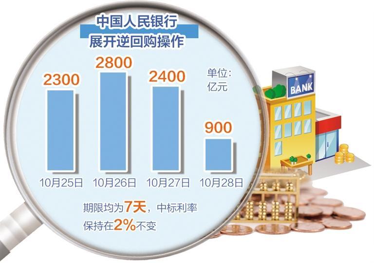 臨近月末,公開市場操作再現(xiàn)千億元級逆回購。10月27日、28日,中國人民銀行公開市場業(yè)務(wù)交易公告稱,為維護月末流動性平穩(wěn),分別以利率招標(biāo)方式開展了2400億元和900億元逆回購操作。10月25日、26日,人民銀行分別開展了2300億元、2800億元逆回購操作,期限均為7天,中標(biāo)利率均保持在2%不變。