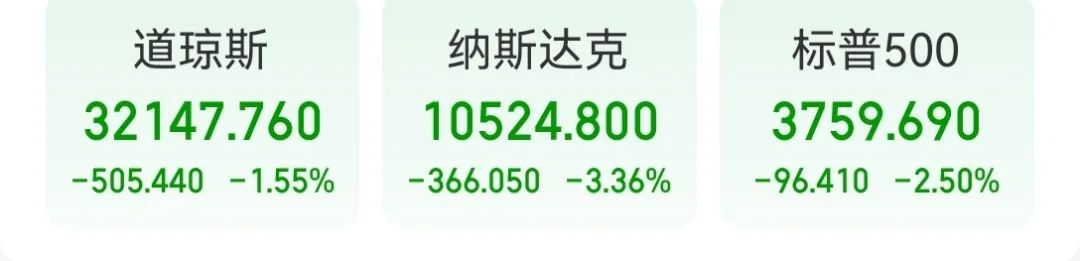 最終,美國三大股指收盤下跌。道瓊斯工業(yè)平均指數(shù)下跌505.44點,跌幅1.55%;標準普爾500指數(shù)下跌96.410點,跌幅2.51%;納斯達克綜合指數(shù)下跌366.050點,跌幅3.36%。