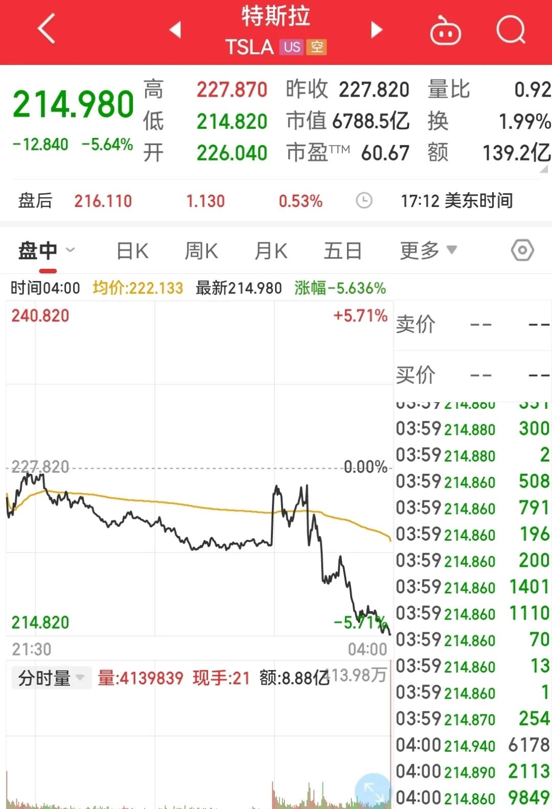特斯拉(TSLA)報214.98美元/股,跌幅5.64%,最新市值6788.5億美元,市值一夜蒸發(fā)405億美元(約2952.37億元人民幣)