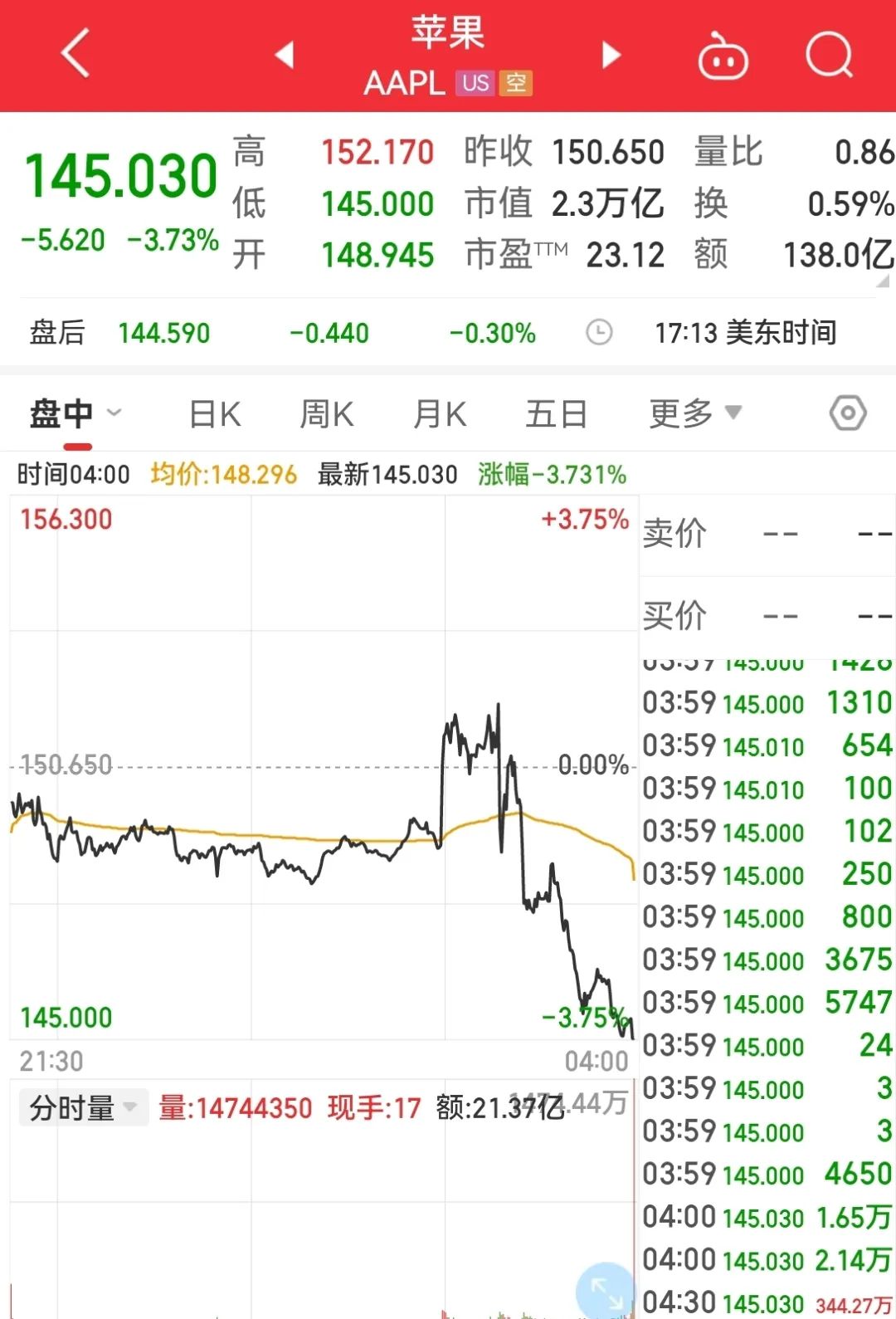 蘋果(AAPL)報145.03美元/股,跌幅3.73%,最新市值2.3萬億美元,市值一夜蒸發(fā)894億美元,約6517.08億元人民幣。