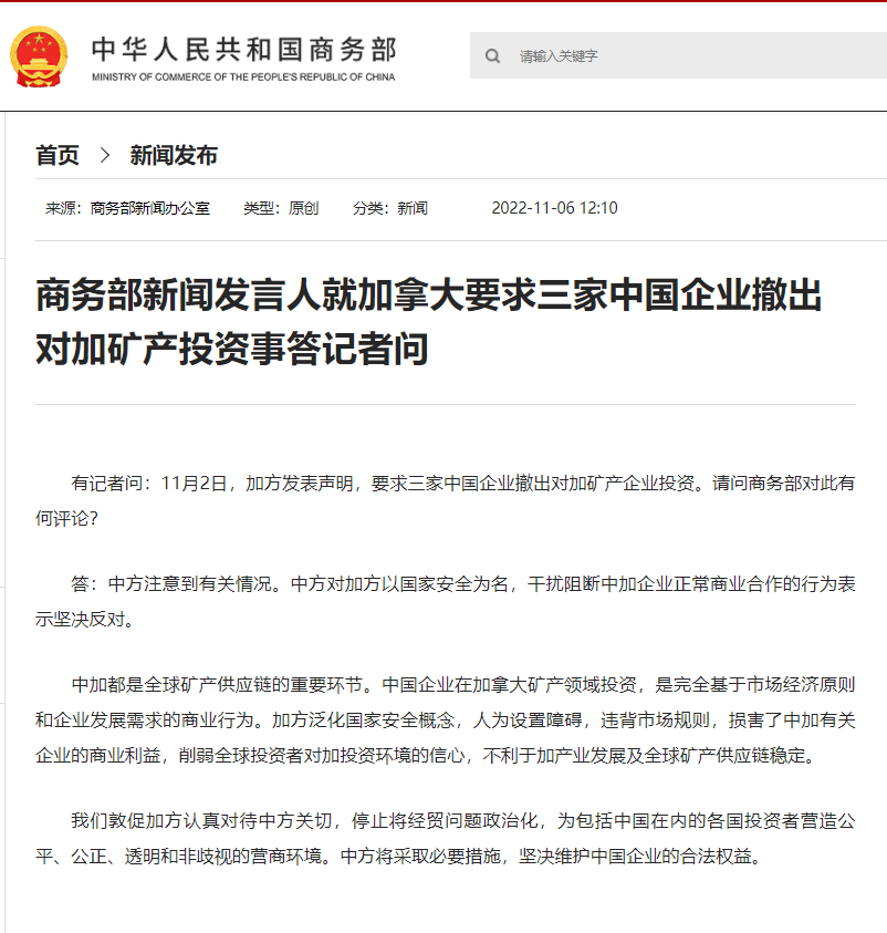 有記者問:11月2日,加方發(fā)表聲明,要求三家中國企業(yè)撤出對加礦產(chǎn)企業(yè)投資。請問商務(wù)部對此有何評論?