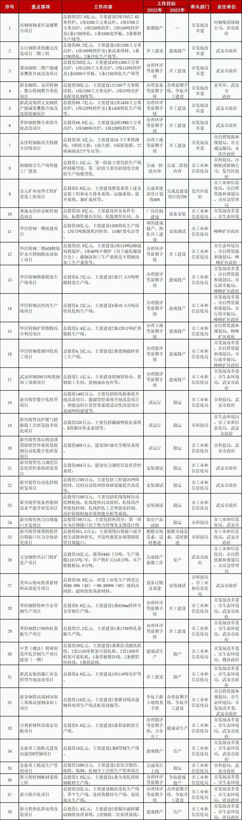 隨《方案》出臺的還有38個(gè)鋼鐵項(xiàng)目具體情況及近兩年工作目標(biāo),詳情如下: