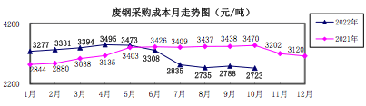 廢鋼10月份加權(quán)平均采購(gòu)成本為2722.85元/噸,環(huán)比下降65.32元/噸,降幅為2.34%。1-10月累計(jì)平均采購(gòu)成本為3177.06元/噸,同比下降75.75元/噸,降幅為2.33%。