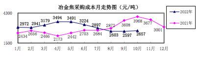 冶金焦10月份加權(quán)平均折算成干基的采購(gòu)成本2657.32元/噸,環(huán)比升高60.48元/噸,升幅為2.33%。1-10月累計(jì)平均折算成干基的采購(gòu)成本為2995.55元/噸,同比升高210.10元/噸,升幅為7.54%。