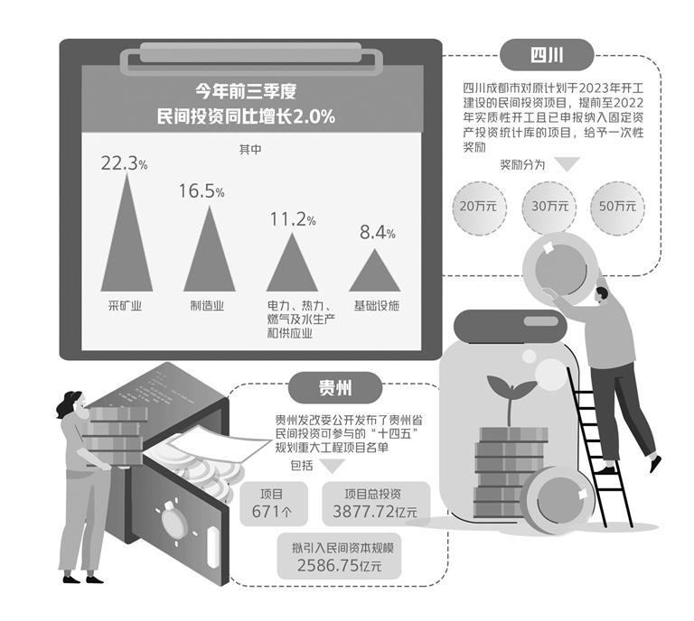 當前,一系列撬動民間投資的政策舉措正加快落地。日前,四川印發(fā)《四川省縣域民營經(jīng)濟改革試點方案》,提出了鼓勵民間投資的7條試點激勵支持措施;貴州近期向社會公布民間投資可參與的“十四五”規(guī)劃重大工程項目名單,項目總投資3877.72億元,擬引入民間資本2586.75億元,涉及農(nóng)林水利、交通運輸、新型基礎(chǔ)設(shè)施、制造業(yè)等19個領(lǐng)域……