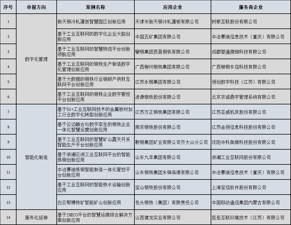 12月5日,工信廳發(fā)布202年工業(yè)互聯(lián)網(wǎng)平臺創(chuàng)新領(lǐng)航應(yīng)用案例入圍名單,該名單是根據(jù)《工業(yè)和信息化部辦公廳關(guān)于開展2022年工業(yè)互聯(lián)網(wǎng)平臺創(chuàng)新領(lǐng)航應(yīng)用案例征集活動的通知》(工信廳信發(fā)函〔2022〕233號),經(jīng)企業(yè)自主申報、地方推薦、專家評審等環(huán)節(jié)而形成,其中聚集了工業(yè)企業(yè)數(shù)字化轉(zhuǎn)型面臨的關(guān)鍵問題,包含平臺化設(shè)計、數(shù)字化管理、智能化制造、網(wǎng)絡(luò)化協(xié)同、個性化定制、服務(wù)化延伸等六大應(yīng)用模式。在入圍的137個應(yīng)用中,涉及鋼鐵行業(yè)14個,具體名單如下: