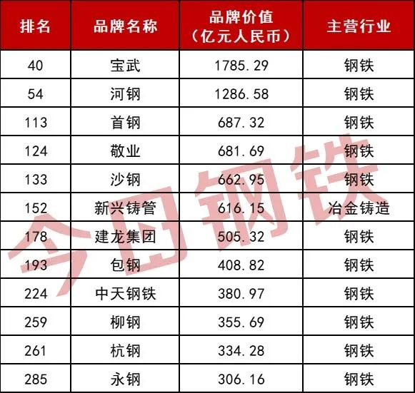 其中,鋼鐵相關行業(yè)共有12家企業(yè)上榜,寶武以品牌價值1785.29億元榮列榜單第40位,位居鋼鐵行業(yè)榜首。