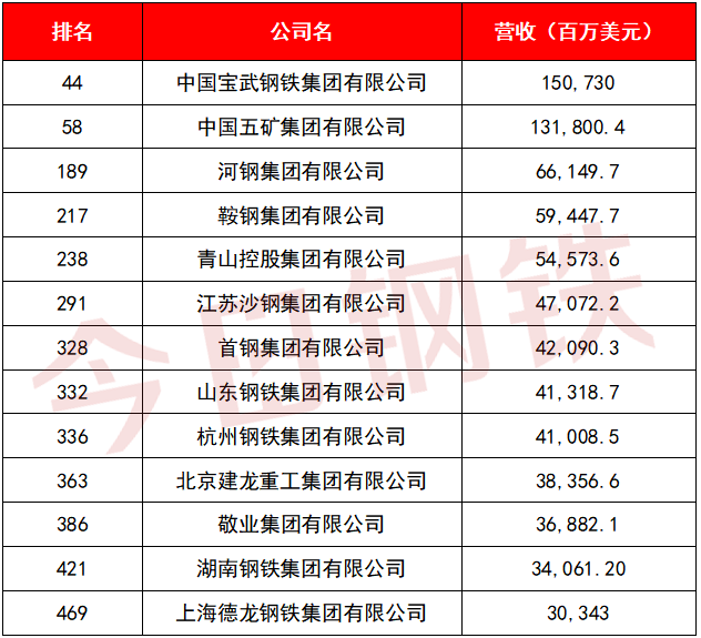 2022年8月3日,2022年《財富》世界500強排行榜揭曉,中國寶武、中國五礦、河鋼、鞍鋼、青山控股集團、江蘇沙鋼、首鋼、山鋼、杭鋼、建龍、敬業(yè)集團、湖南鋼鐵、上海德龍鋼鐵入選500強榜單。其中,杭鋼、湖南鋼鐵、上海德龍鋼鐵首次上榜。中國寶武繼去年首次進入前100強后,首次挺進前50強,排名第44位,較去年躍升28位,繼續(xù)保持在全球鋼鐵企業(yè)的首位。鞍鋼集團今年的名次上升速度最快,較去年躍升183位,列第217位。上榜的民營鋼企數(shù)量由2021年的3席增加到了4席。此外,9月6日,2022中國企業(yè)500強等名單發(fā)布,近60家鋼企上榜。