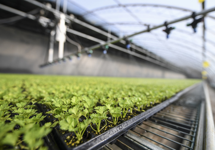 2月1日,賀蘭縣景沃佳禾種苗繁育基地的水肥一體式噴灌機在給西芹幼苗補水施肥。臨近立春,寧夏銀川市賀蘭縣各主要種苗繁育基地的大棚內(nèi)滿眼綠意,工人們忙著為即將到來的春耕培育幼苗。新華社記者 馮開華 攝