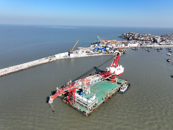 1月29日,在江蘇省連云港市連島國家級中心漁港,大型浮吊在海上作業(yè)(無人機照片)。新華社發(fā)(王春攝)