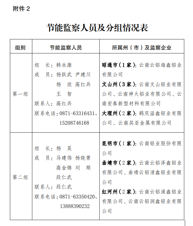 (一)請相關州(市)發(fā)展改革委派專人配合開展本地區(qū)電解鋁企業(yè)的現場節(jié)能監(jiān)察,并通知企業(yè)做好相關準備工作。節(jié)能監(jiān)察人員及分組情況詳見附件2。